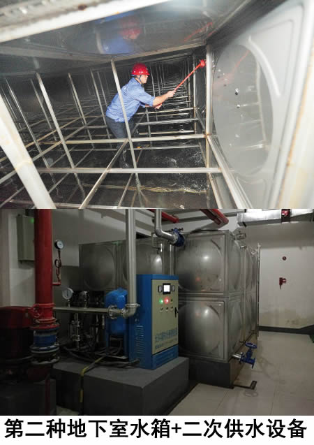 是通過地下室加壓泵將水送至樓頂?shù)乃?,然后再自然流到用戶家中。這種供水方式,二次供水水箱一般都在樓頂;