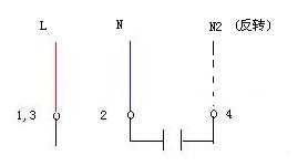 當(dāng)兩繞組完全一樣,電機(jī)可能是三端子接線,1,3為兩繞組的公共接線端,接交流電源的L, 2/4端子之間聯(lián)有啟動(dòng)電容, 如果交流電源的N端接端子2為正轉(zhuǎn),則N改接端子4為反轉(zhuǎn);如果是四端子,見圖四接線;